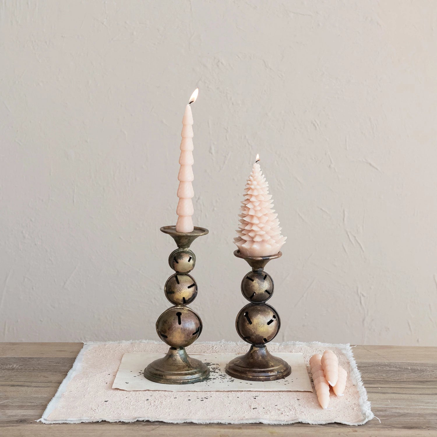 This tall antique brass pillar candleholder is a merry addition to the holiday decor. The round base, adorned with miniature jingle bells, adds a playful touch, while the antique brass finish brings a sense of nostalgia. Each candleholder is crafted to hold a 3-inch pillar candle, casting a warm glow that's sure to enhance the cozy ambiance of the home. The varying designs ensure that any piece is one-of-a-kind, much like the cherished memories it will help create. Whether it's the centerpiece of the table or adding a jingle to the hearth, this candleholder is a festive treasure. Elegant and whimsical, it's a holiday must-have that will bring joy for seasons to come. A tall round metal candleholder, with a jingle bell base, finished in antique brass for a classic holiday charm. A piece that resonates with the sounds of the season, it's a delightful addition to any holiday decor, from mantels to festive tables. Ideal for holding a 3-inch pillar candle, this candleholder is perfect for creating a warm and inviting holiday atmosphere.